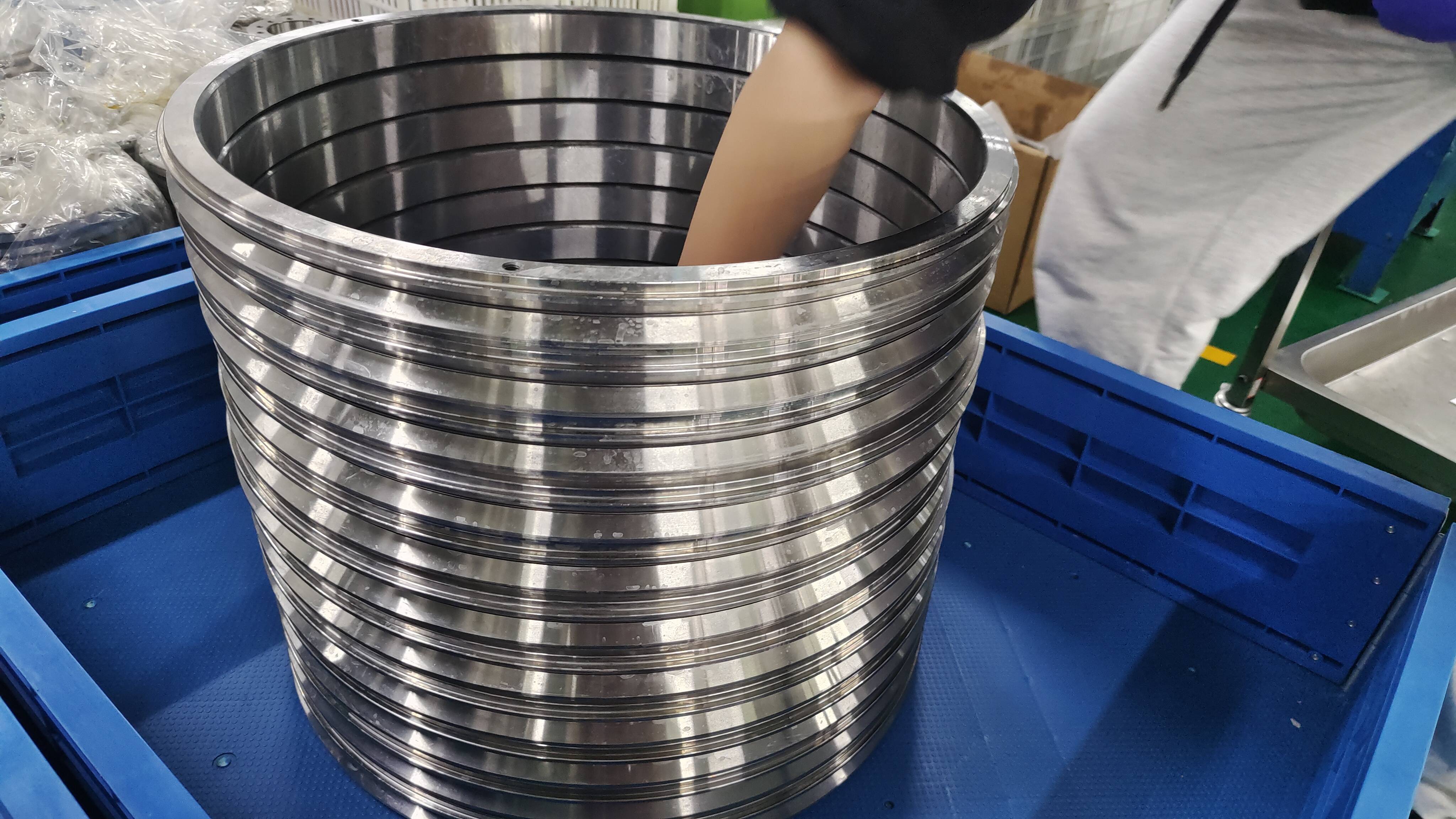 3、交叉滾子軸承:交叉滾子軸承在轉(zhuǎn)臺上的應(yīng)用也比較的普遍。交叉滾子軸承的特征是軸承中有兩個滾道,兩排交叉排列的滾子。與傳統(tǒng)的推力軸承+徑向定心軸承組合相比,交叉滾子軸承結(jié)構(gòu)緊湊,體積小巧,并簡化了工作臺設(shè)計,從而降低了轉(zhuǎn)臺的成本。